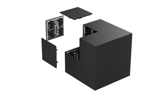 Cube-shaped high-resolution panels (P1.9–P3.91 mm), indoor only, modular, portable, delivering 360° immersive visuals.